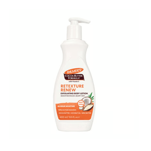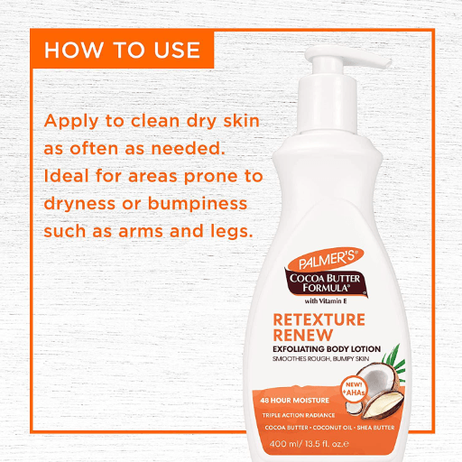 Smooth rough, bumpy skin with Palmer's Cocoa Butter Formula Exfoliating Body Lotion, with triple-action firming and 14-hour moisture.