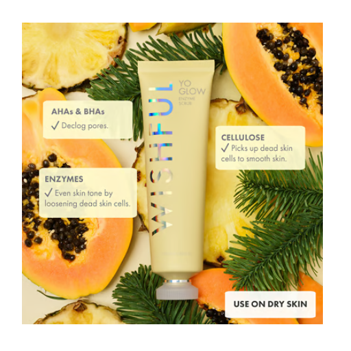 Say bye-bye to dead skin with this milky gel-to-peel Wishful Yo Glow AHA & BHA Facial Enzyme Scrub; it’s a 3-in-1 physical, chemical and enzymatic exfoliant with AHAs & BHAs that gently smooths, brightens and evens out skin tone for glowy, baby-soft skin (instantly and over time!).